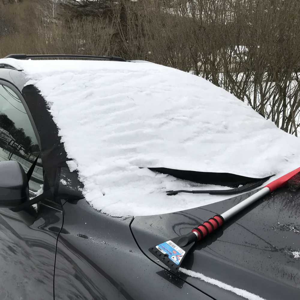 Setup takes less than a minute. Place the cover across your windshield with the correct side facing outward (black thermal layer for winter, silver reflective layer for summer). Slide the side flaps inside your front doors and close them to secure everything in place. The built-in magnets along the edges automatically attach to your hood.
